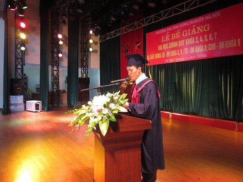 Trong niềm vui ngày tốt nghiệp, đại diện cho các tân kỹ sư, em Dương Văn Hiền – sinh viên lớp ĐH CNKT CK2 – K7, đã phát biểu, bày tỏ lòng biết ơn sâu sắc tới Ban lãnh đạo khoa Cơ khí, các thầy cô giáo, đã tận tâm truyền đạt cho các em những kiến thức, kỹ năng cần thiết trong suốt quá trình học tập và xin hứa sẽ đem những kiến thức đã học, vận dụng sáng tạo vào công việc và cuộc sống để khỏi phụ lòng mong đợi của thầy cô, để xứng đáng với những gì thầy cô đã dạy dỗ, xứng đáng với truyền thống của các thế hệ sinh viên Đại học Công nghiệp Hà Nội. Em bày tỏ “Ngày hôm nay khi đã hoàn thành chương trình của khóa học, được công nhận tốt nghiệp và được vinh dự khoác trên mình bộ lễ của những Tân kỹ sư ĐH Công nghiệp Hà Nội, chúng em cảm thấy thật tự hào, vui mừng và xúc động, chúng em sẽ luôn luôn ghi nhớ công lao của các thầy các cô, người đã cho chúng em những kiến thức, những kinh nghiệm quý báu để làm hành trang cho sự nghiệp sau này”.